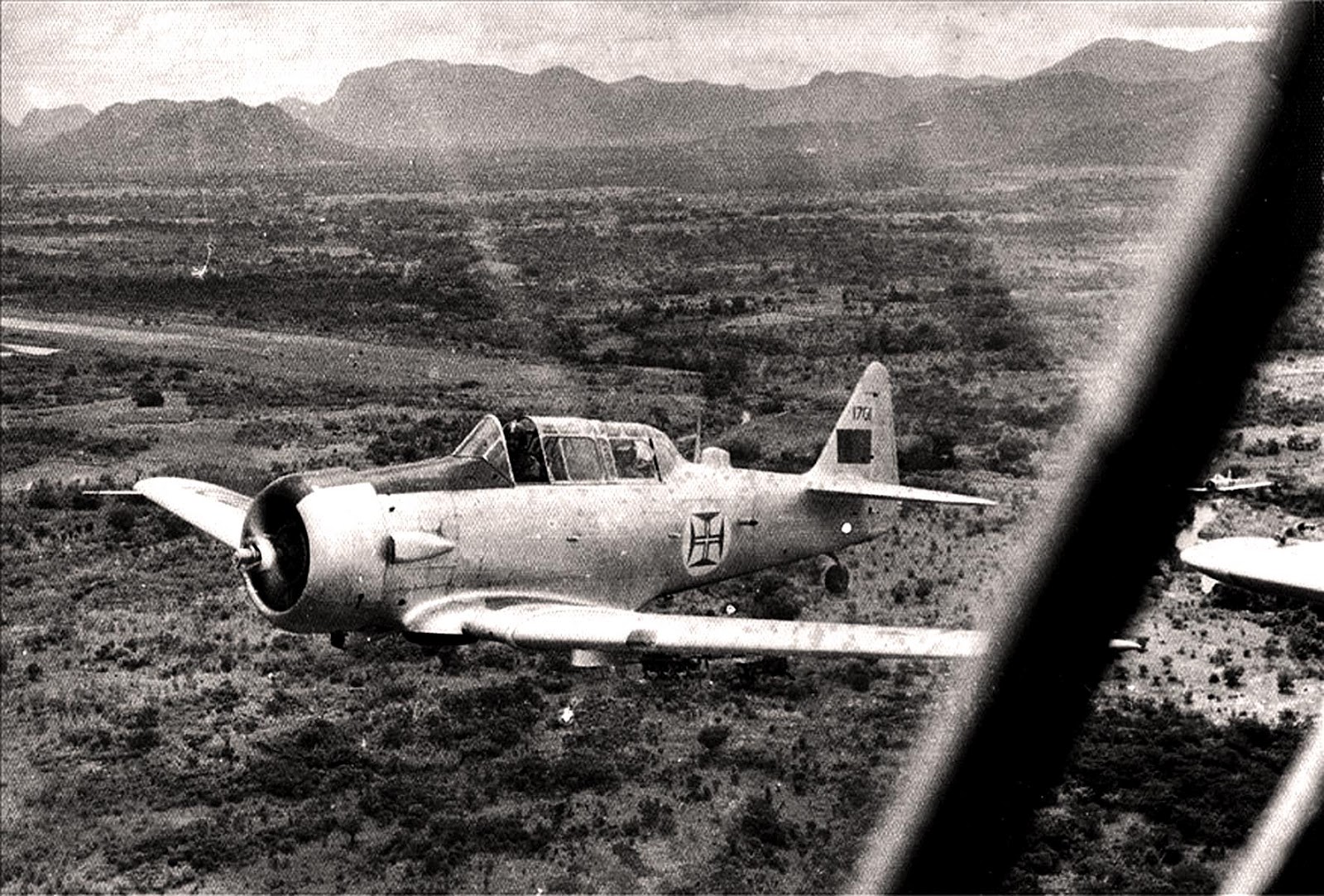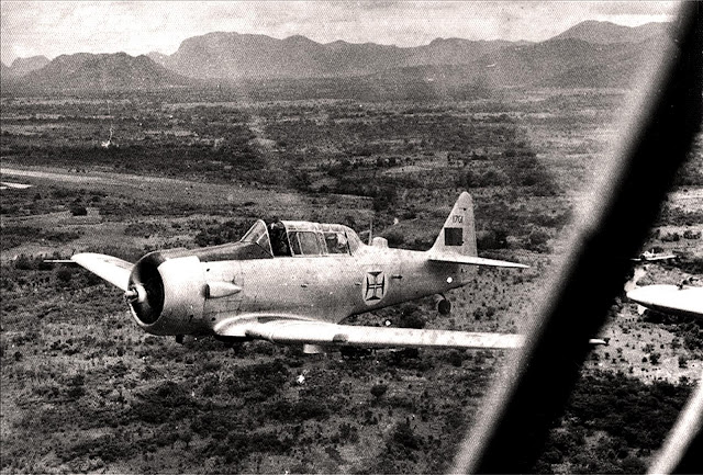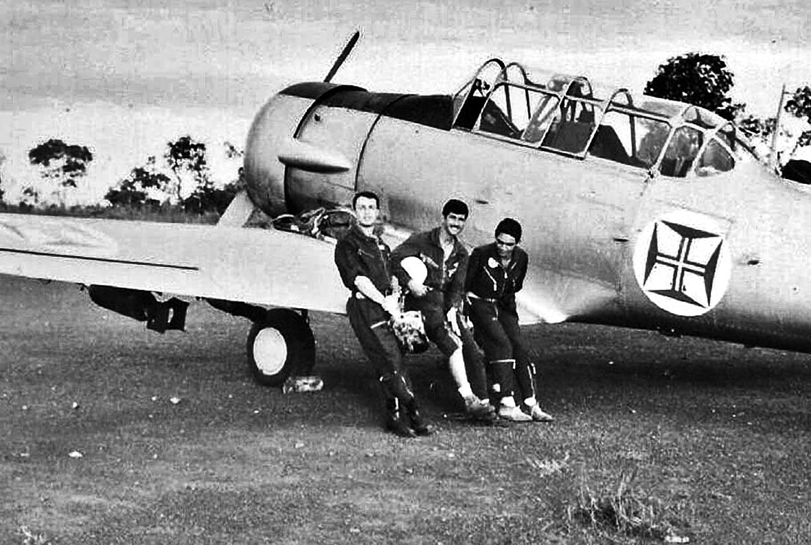 Este, acabado de chegar da Metrópole (Portugal Continental) após o curso de piloto miliciano, na sua 1.ª missão que poderia ser de combate. mas num avião sem rádio!