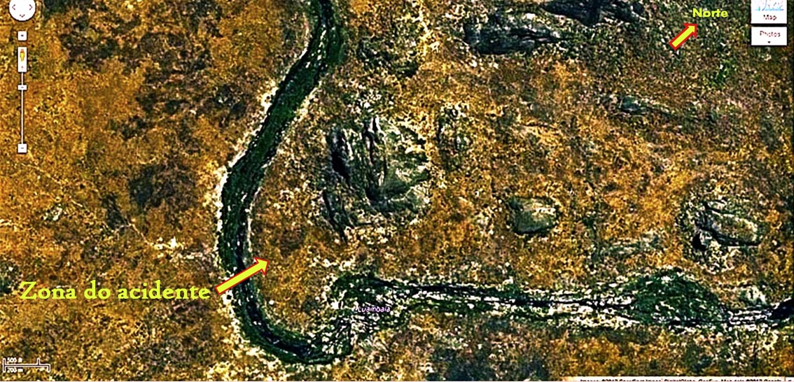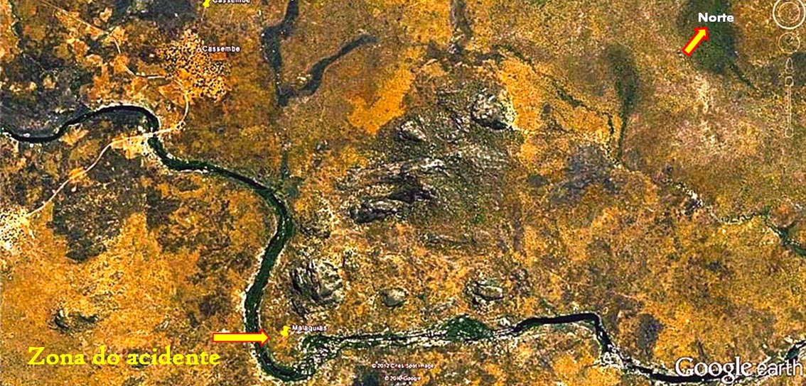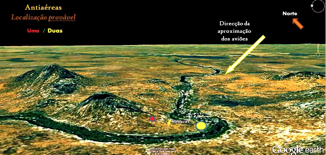 Já a sobrevoar o local indicado por ele, entre o Monte e o rio, procuro encontrar palhotas ou quaisquer outros sinais de actividade humana recente. Claro está que nada vi, e muito menos fogo de antiaérea.