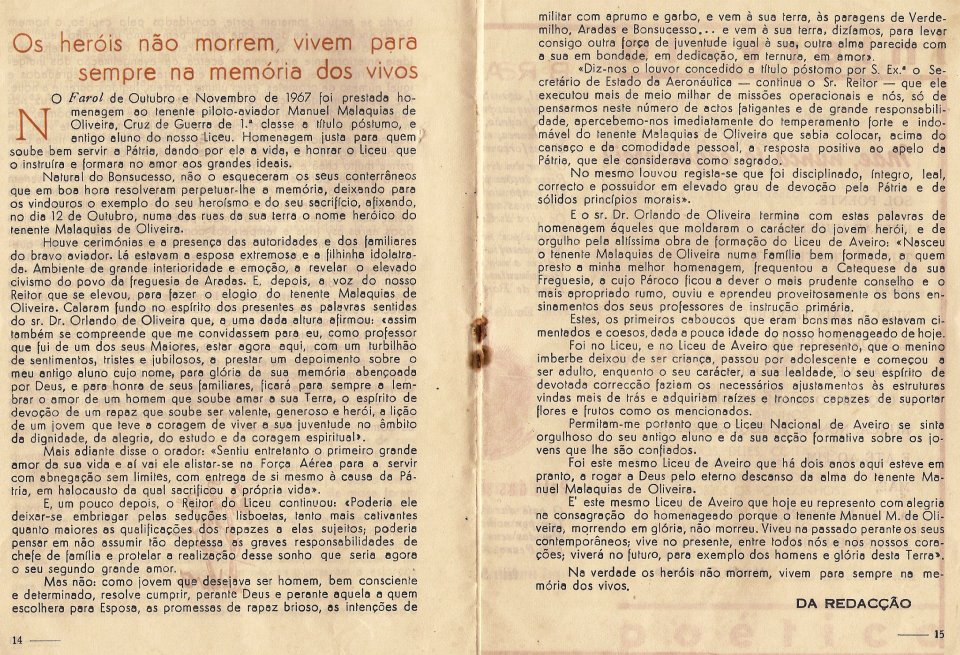 No dia 14 de Outubro de 1967, na minha função de Sargento Miliciano Piloto da Força Aérea em Comissão Voluntária de Serviço em Moçambique, na Guerra do Ultramar, tive como missão fazer um RVIS (Reconhecimento Visual de possíveis posições do inimigo) no avião T-6 com matricula 1753, a partir da minha Base em Vila Cabral (Lichinga, nome actual), a capital Nortenha do Distrito do Niassa.